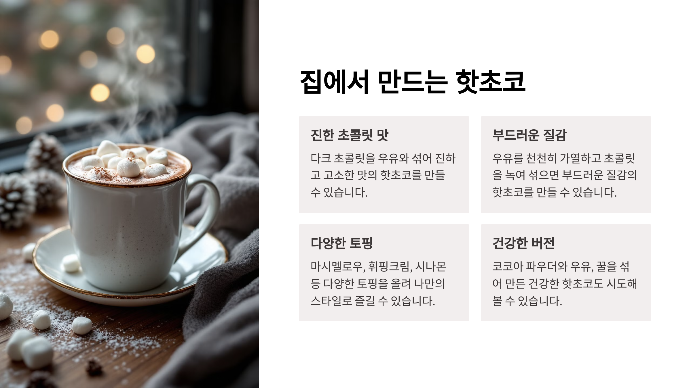 집에서 만들 수 있는 핫초코 레시피는 다양하며, 각자의 취향에 맞춰 커스터마이징할 수 있는 장점이 있습니다.
