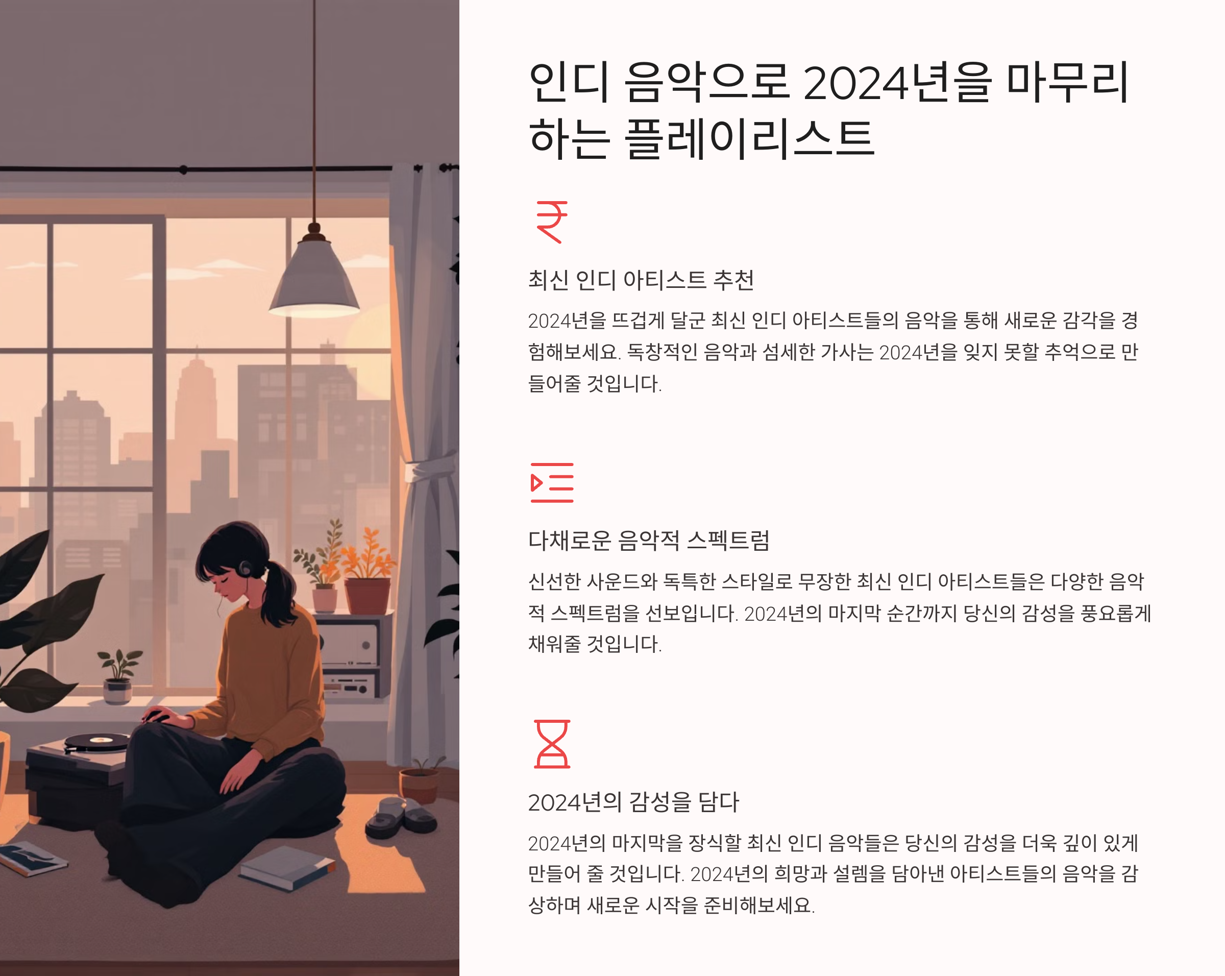 - 휴식 시간: 혼자서 휴식을 취할 때는 감성적인 발라드나 아카펠라 음악을 들으며 한 해를 돌아보는 시간을 가져보세요.