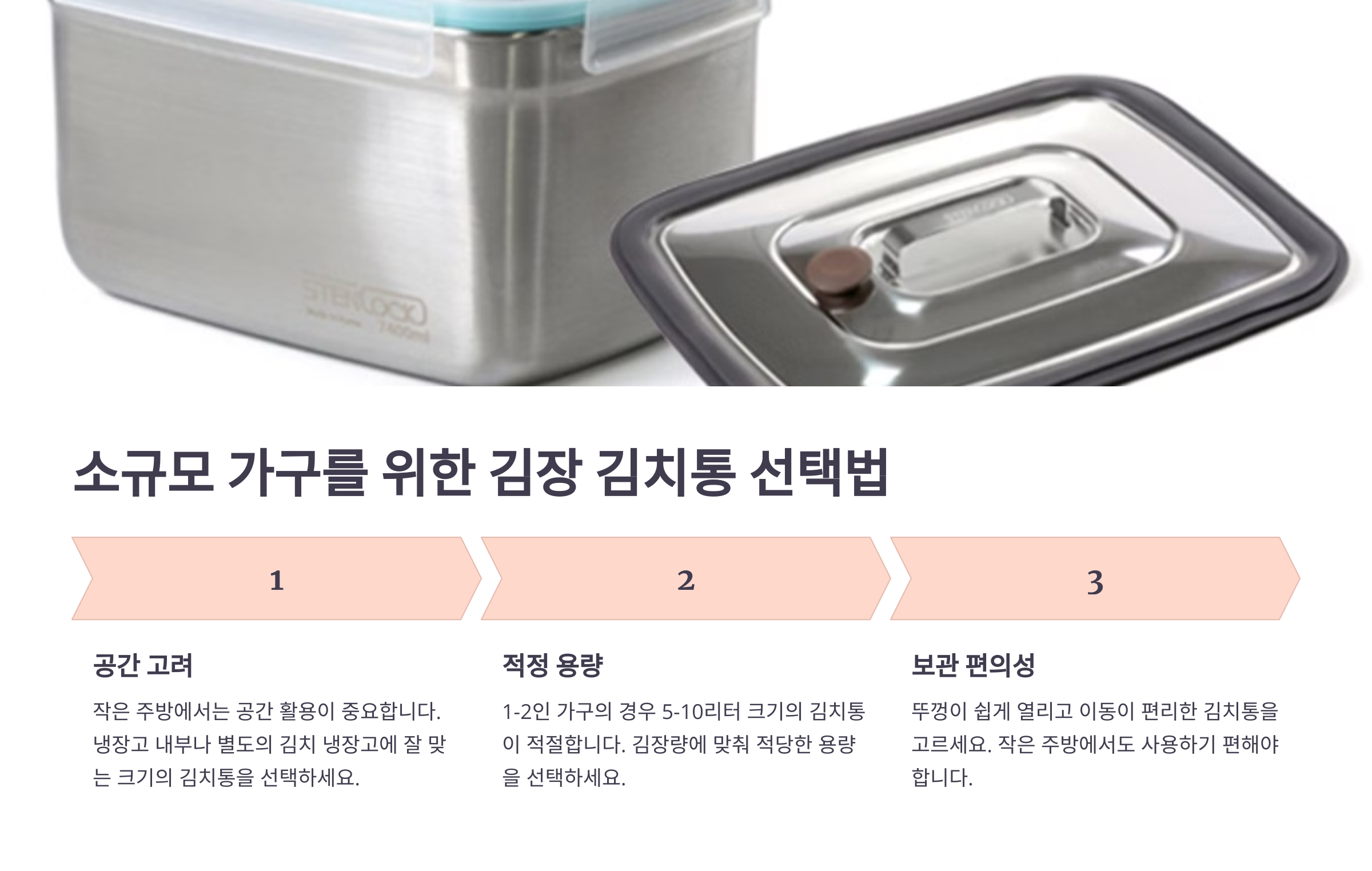 뚜껑이 쉽게 열리고 이동이 편리한 김치통을 고르세요. 작은 주방에서도 사용하기 편해야 합니다.