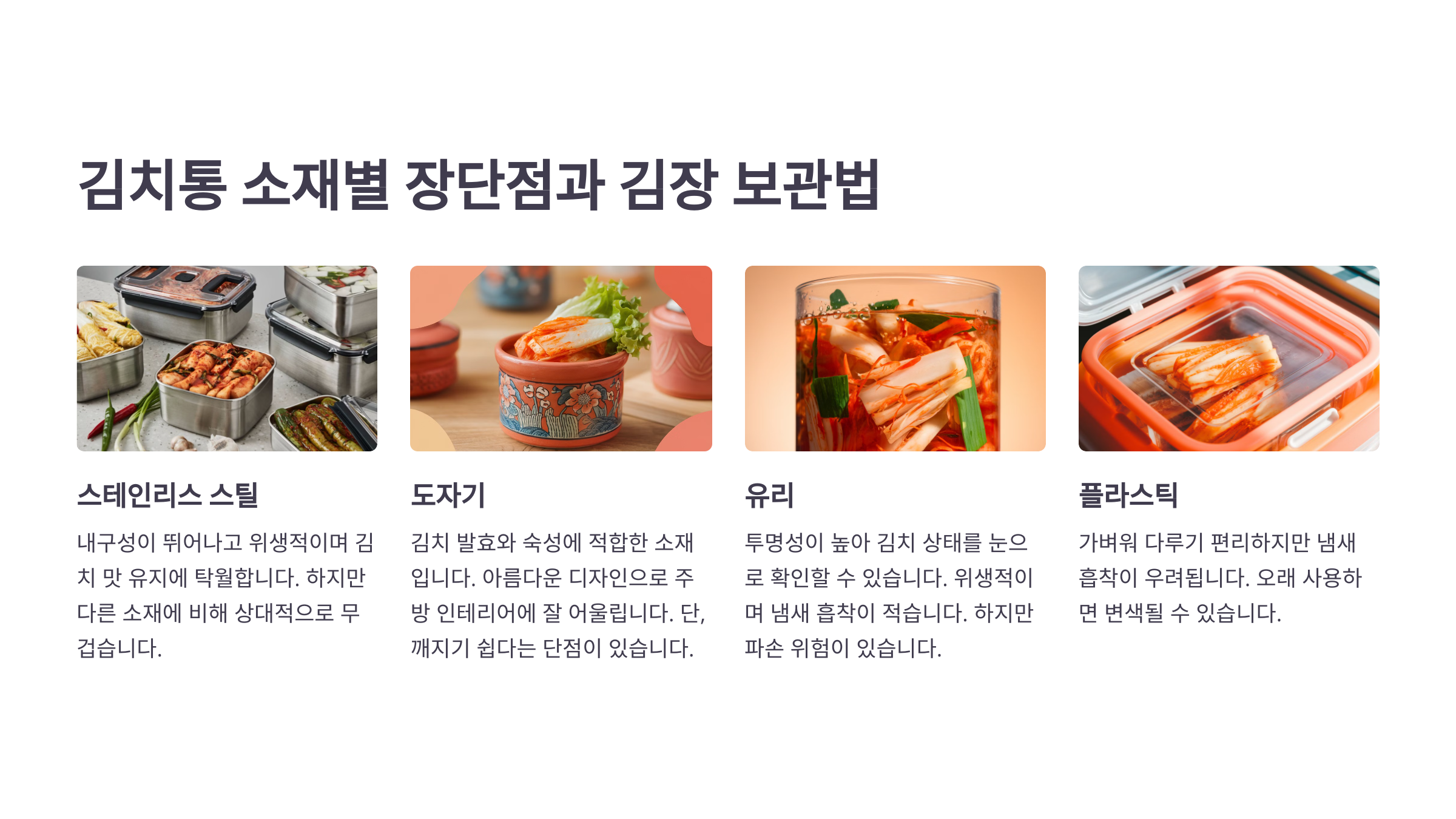 내구성이 뛰어나고 위생적이며 김치 맛 유지에 탁월합니다. 하지만 다른 소재에 비해 상대적으로 무겁습니다.