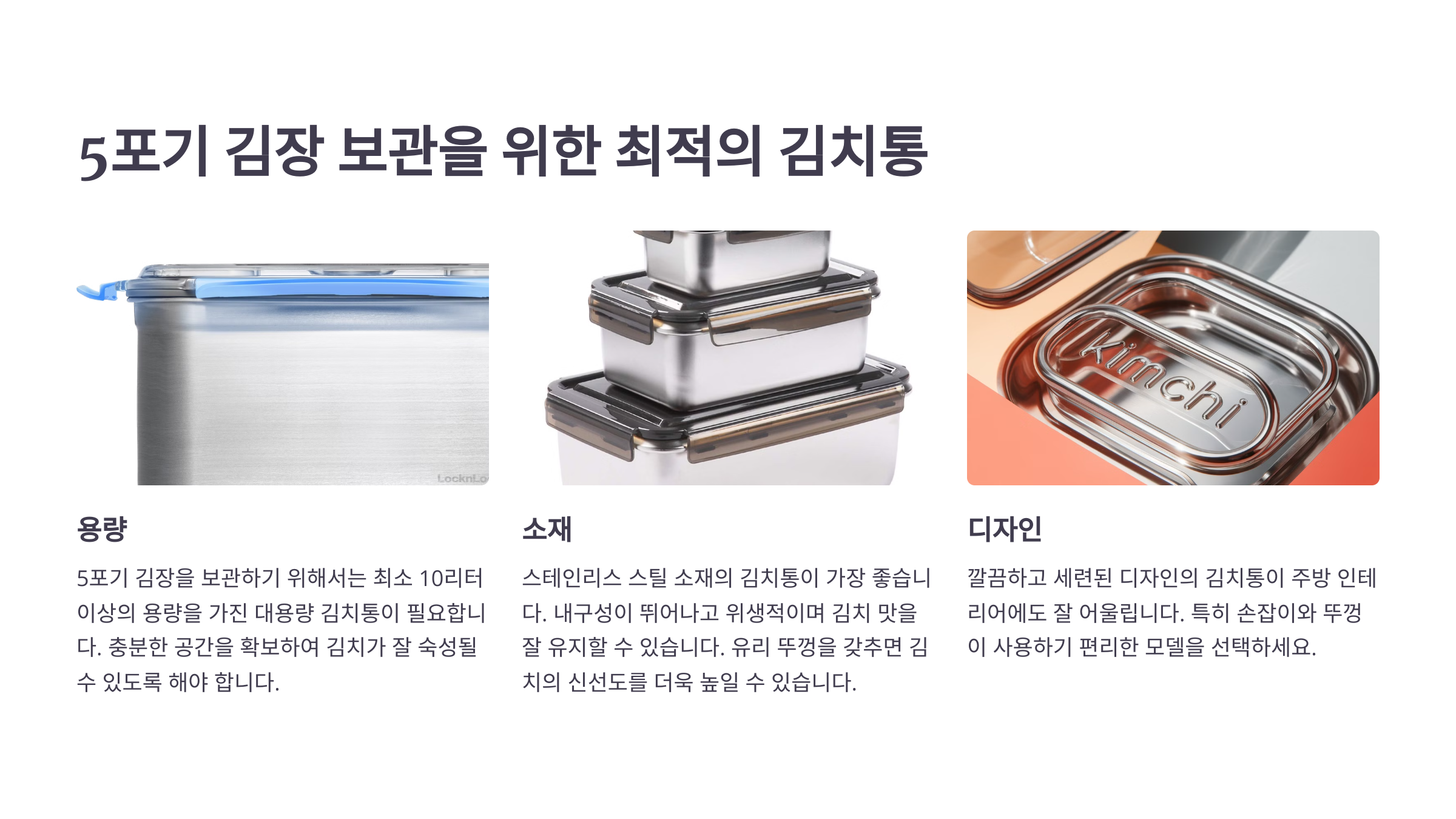 깔끔하고 세련된 디자인의 김치통이 주방 인테리어에도 잘 어울립니다. 특히 손잡이와 뚜껑이 사용하기 편리한 모델을 선택하세요.