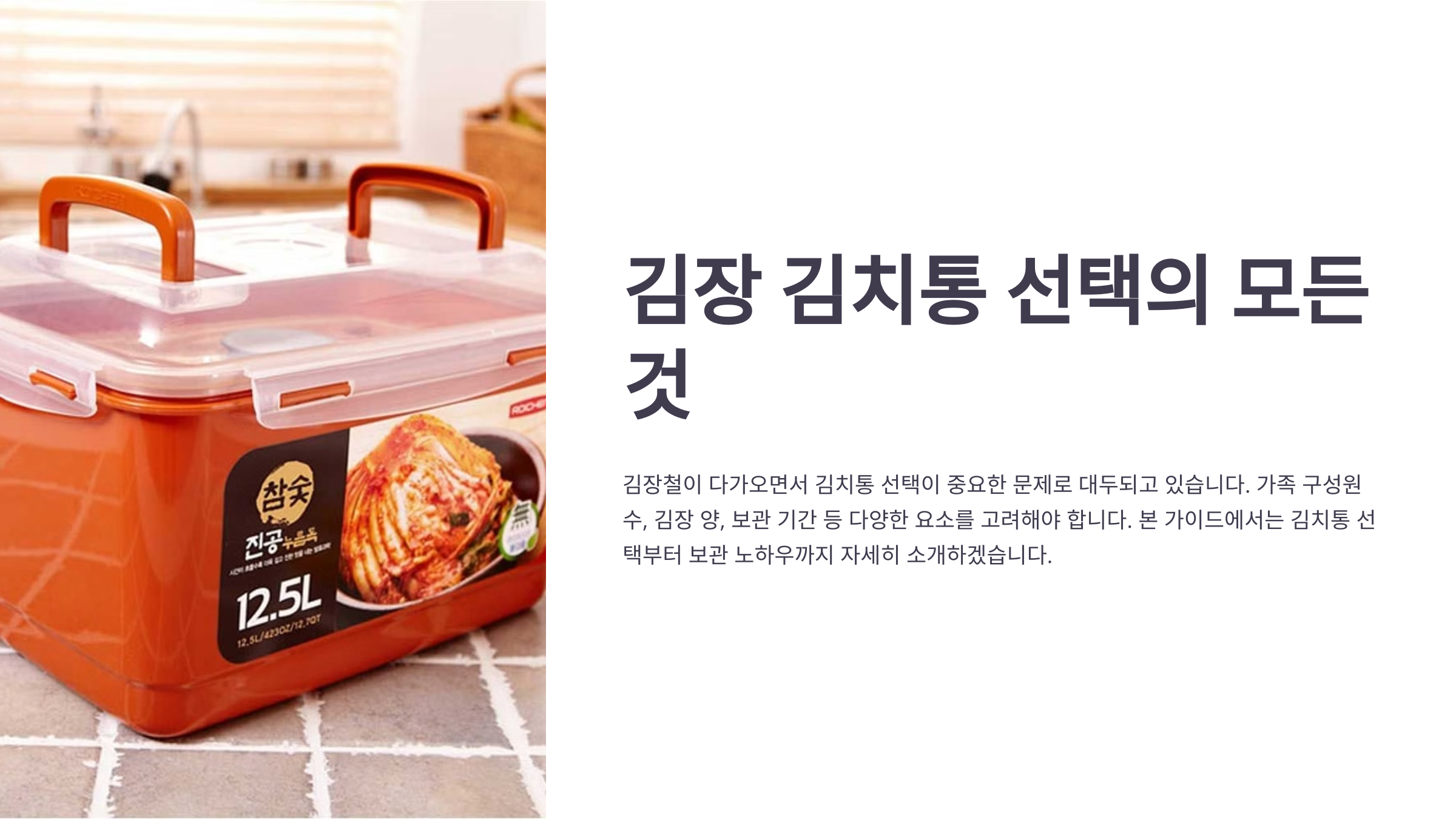 김장철이 다가오면서 김치통 선택이 중요한 문제로 대두되고 있습니다. 가족 구성원 수, 김장 양, 보관 기간 등 다양한 요소를 고려해야 합니다. 본 가이드에서는 김치통 선택부터 보관 노하우까지 자세히 소개하겠습니다.