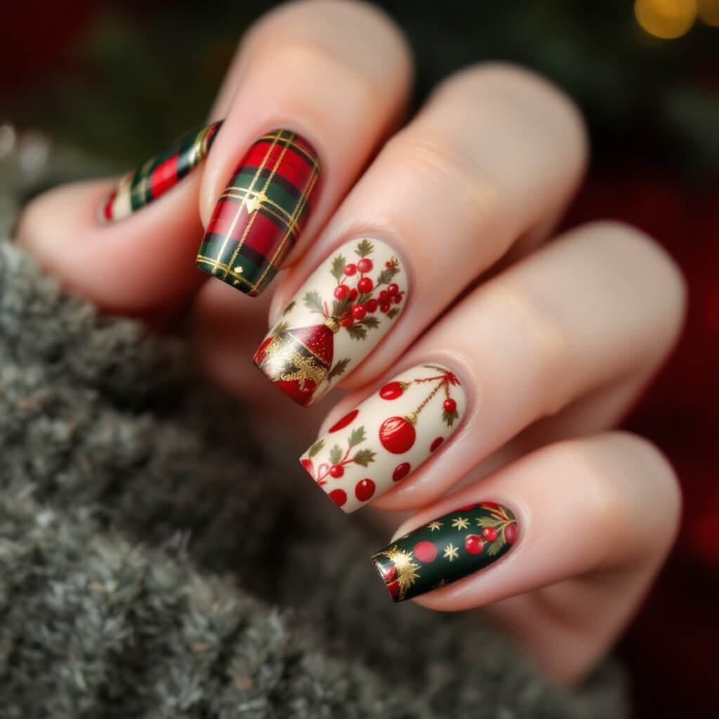 크리스마스 셀프네일 #4 크리스마스를 상징하는 홀리베리로 세련된 포인트 네일을 만들어보세요. 초록 잎사귀와 빨간 베리로 만드는 우아한 크리스마스 네일아트를 소개합니다.