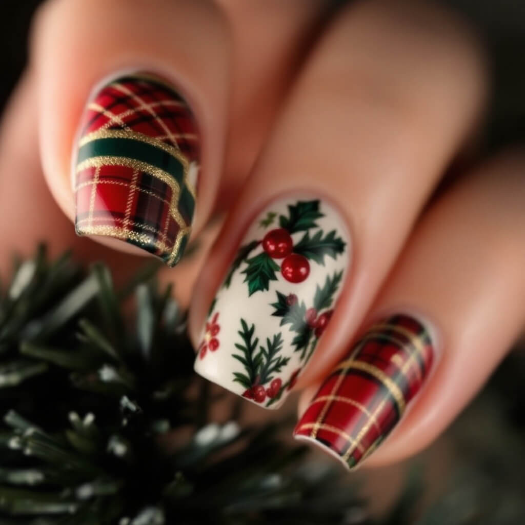 크리스마스 셀프네일 #4 크리스마스를 상징하는 홀리베리로 세련된 포인트 네일을 만들어보세요. 초록 잎사귀와 빨간 베리로 만드는 우아한 크리스마스 네일아트를 소개합니다.